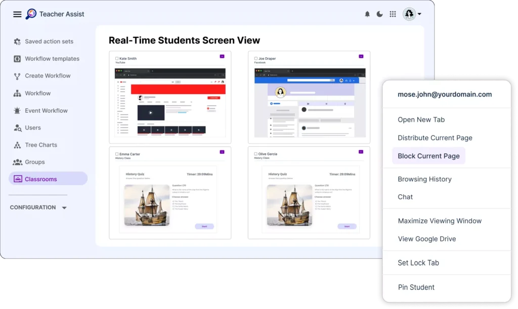 By effectively controlling student browsing during a class. With Teacher Assist, educators can oversee each student’s screen and manage their entire online activity within the Google account. They can customize screen content by switching tabs, delivering lessons, and supervising web browsing to maintain student attention.