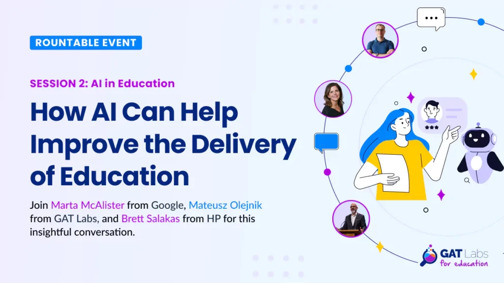 In this second session of GAT Labs’ AI in Education Roundtable Series, Marta McAlister (Google for Education), Brett Salakas (HP Education Ambassador), and Mateusz Olenik (GAT Labs) discuss how AI is reshaping the delivery of education, enhancing learning, supporting educators, and improving accessibility for diverse student needs.