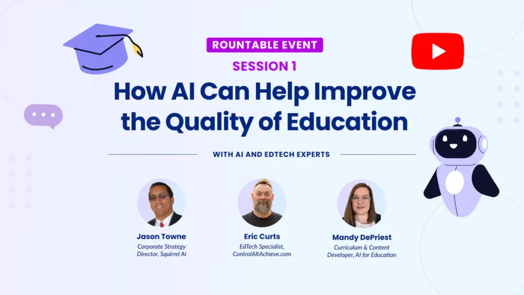 In this session, Jason Towne (Squirrel AI), Eric Curts (ControlAltAchieve), and Mandy DePriest (AI for Education) discuss how AI is transforming pedagogy, student engagement, and classroom practices.