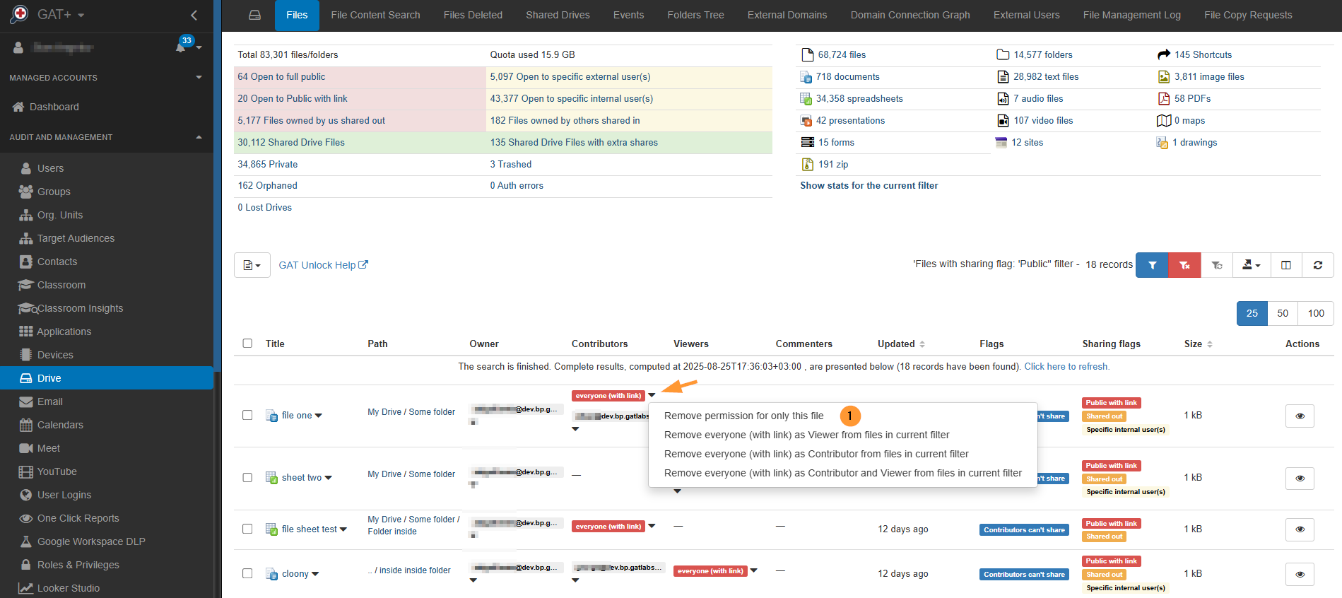 Navigate to the GAT+ > Drive > Files tab > Audit table → Select Full Public (everyone) or Public with link (everyone with link)