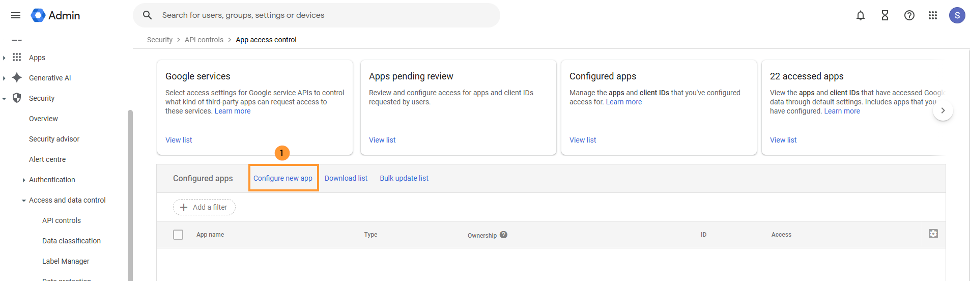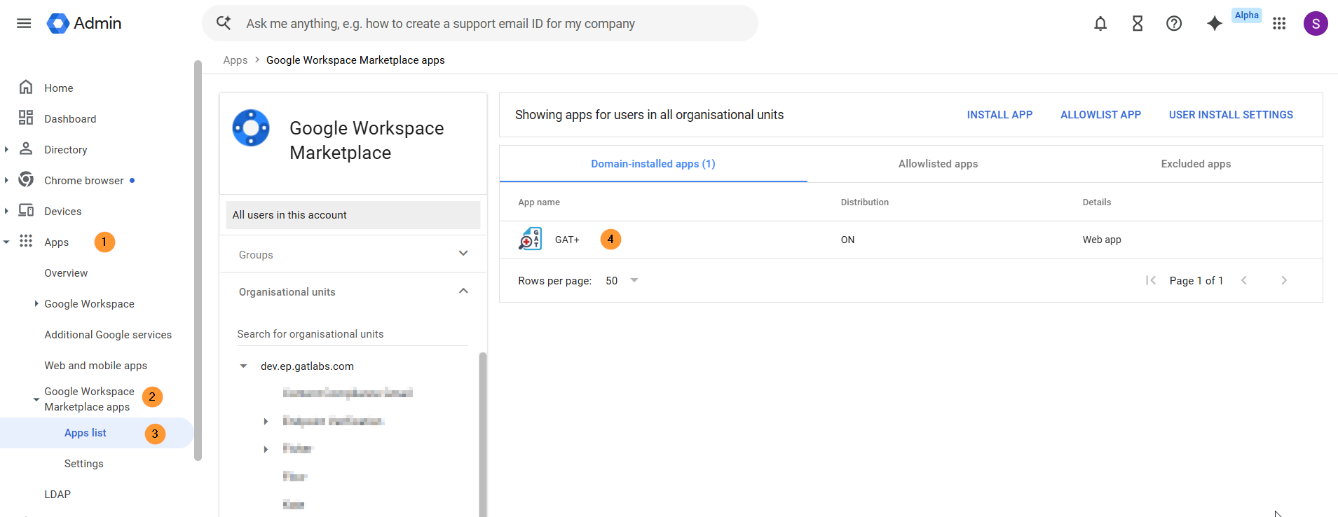 In the Google Admin console, navigate to Apps > Google Workspace Marketplace apps > Apps list