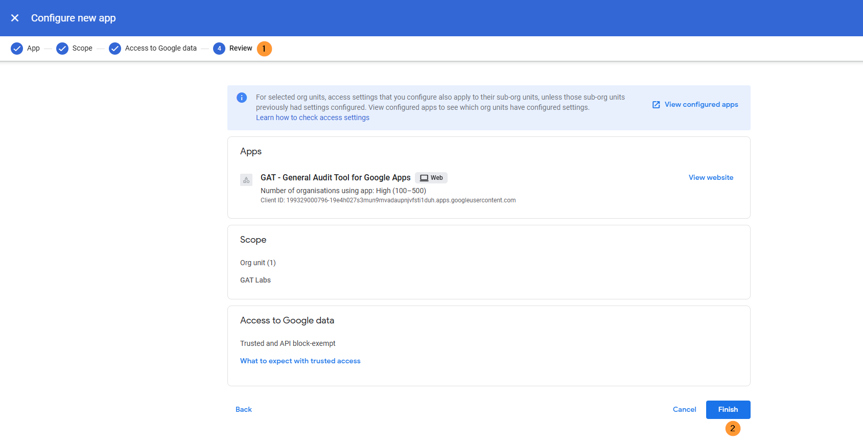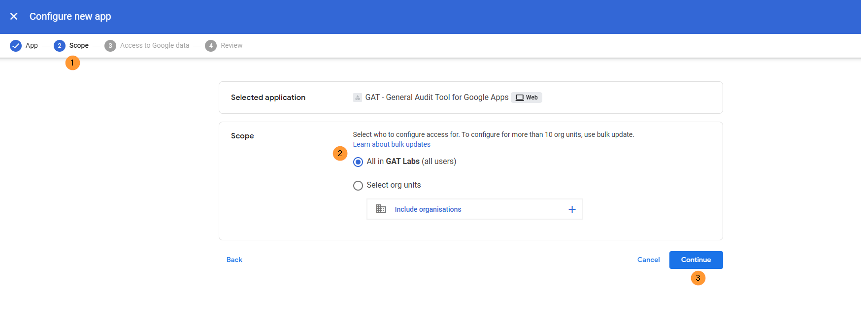 Click on the GAT+ app, then in User Access – select (view organizational units and groups) to select the root Org. unit