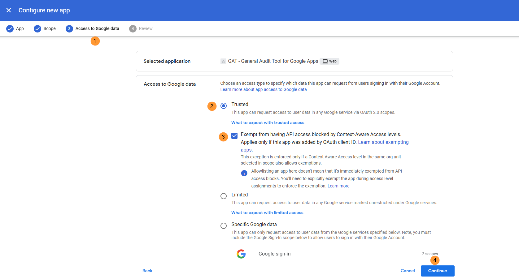 - Access to Google data – Select Trusted and Exempt from having API access blocked by Context-aware access levels.