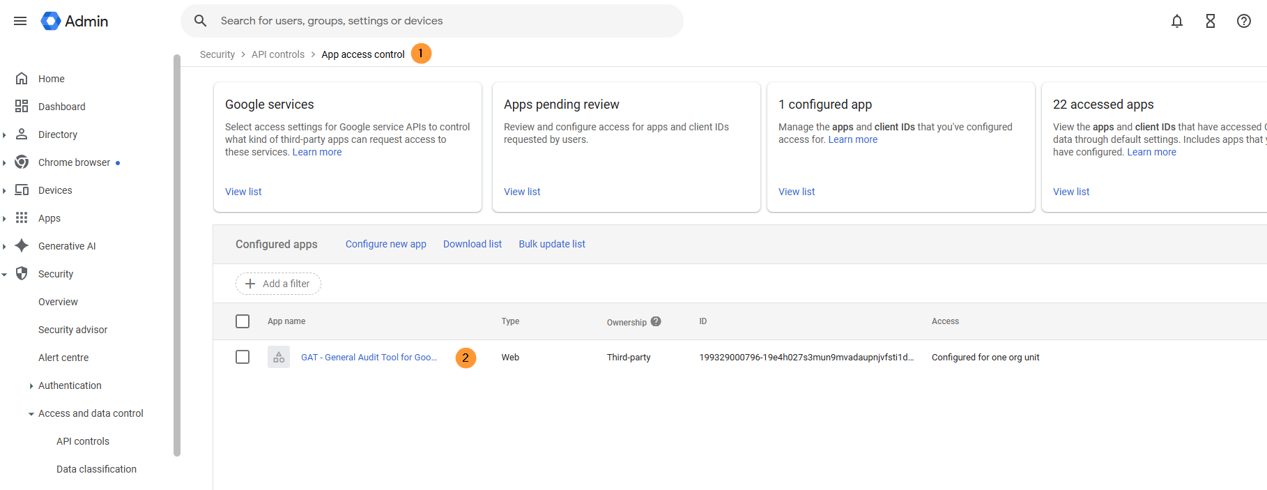Navigate to Google Admin console > Security > Access and data control > API controls > Manage App access