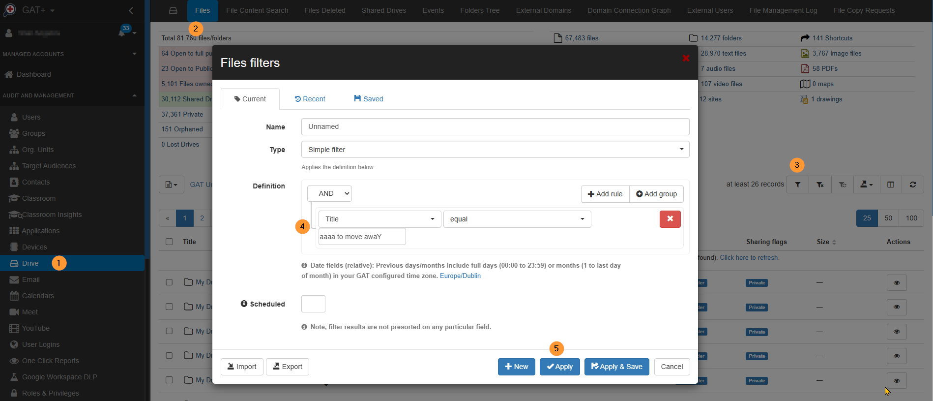Navigate to GAT+ → Drive audit → Apply custom filter → Search for the Folder