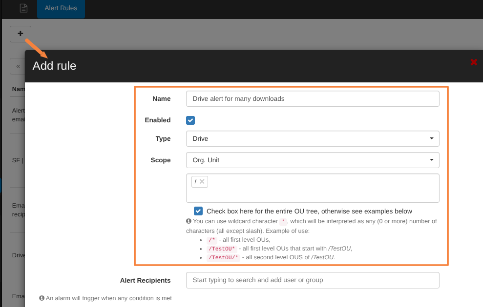 - Alert recipients – Enter recipient emails who will receive an email for the alert (optional). By default, all alerts will be shown in GAT+ > Alerts