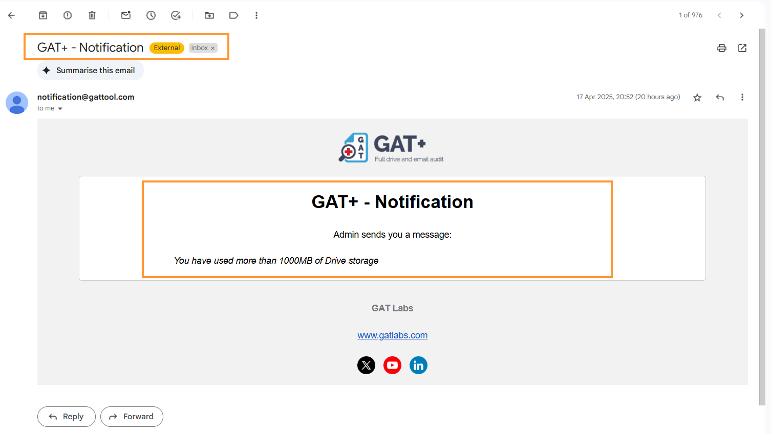 GAT+ allows the Google Workspace admin to view all the users’ Drive quota usage and the option to automate alert notifications to the Admins and end-users when quota reaches a certain threshold.